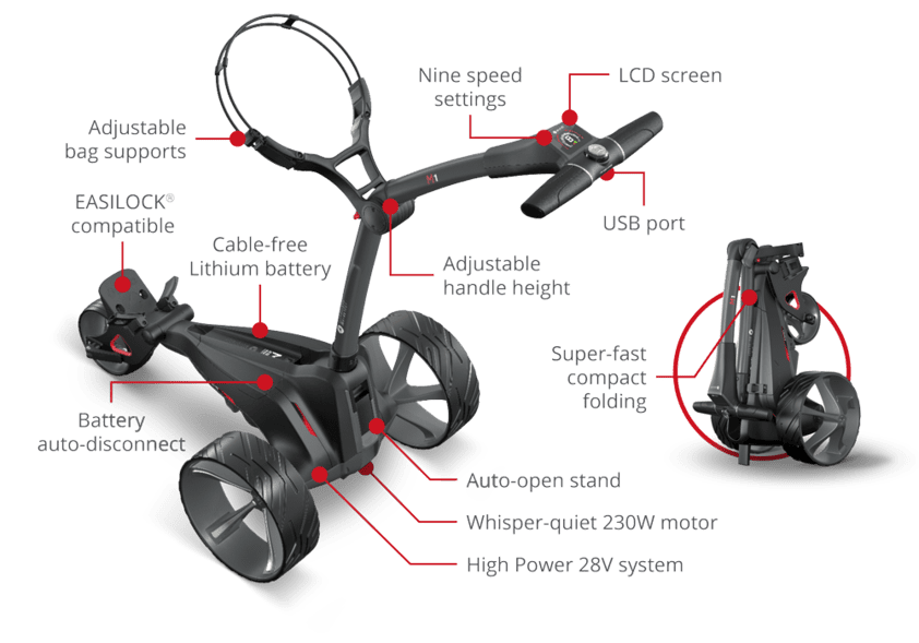 The Motocaddy M1 is the world’s easiest-to-use compact trolley thanks to its simple folding, impressive LCD widescreen display, and nine-speed settings.